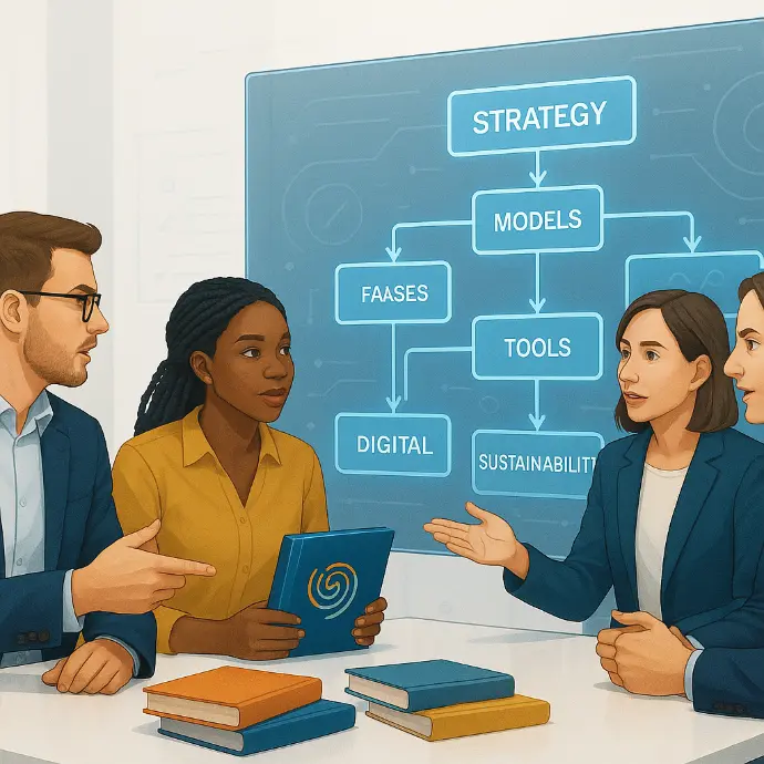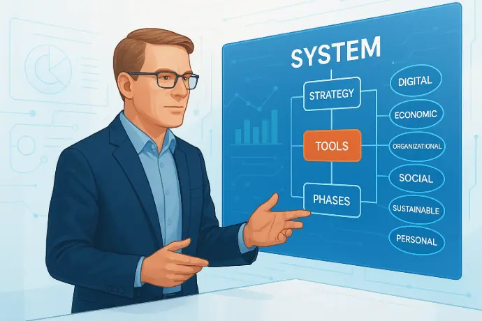 Il sistema è costruito su una mappa concettuale e operativa che attraversa tutte le fasi della trasformazione: analisi, progettazione, implementazione, valutazione. Ogni modulo è collegato a una dimensione della trasformazione - digitale, economica, organizzativa, personale, sostenibile, sociale - e si traduce in contenuti, strumenti, servizi e formazione.